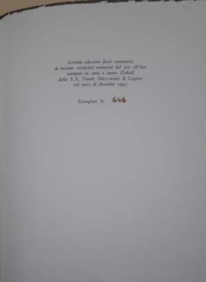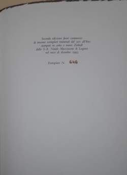 In 8', br. ed. pp. 28, seconda edizione fuori commercio di trecento esemplari numerati dal 501al 800 stampati su carta a mano Zerkall nel mese di dicembre 1993, es. n. 646; conservato all'intermo biglietto di auguri dell'autore.